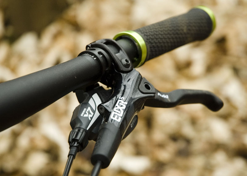 Pokud si chcete cestu dolů vychutnat, musí Vám celé kolo prostě sednout do ruky. 750 mm široká řídítka a 70 mm dlouhý představec zajistí opravdovou jistotu a možnost vybrat krizové situace, stejně tak jak balancovat a proplouvat náročnými pasážemi. Geometrie rámu je konstruovaná stylem nenadchne, neurazí. Nemyslím to nijak špatně, jen je umístěná tak nějak uprostřed, tedy celé kolo dává pocit vyváženého kompromisu mezi točivostí a stabilitou. Příjemným překvapením jsou kliky s rockringem, která je na kole tohohle typu velmi užitečný.