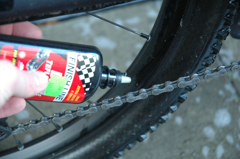 Vidlice namazaná, pohon suchý, jdeme mazat. Důležité je vybrat správné mazivo. Existují řidší, teflonové, do suchého prostředí, které nelepí prach, ale v dešti se rychleji spláchnou z řetězu. Hustší maziva, do mokrého prostředí lépe drží ve vlhku, ale za sucha naopak lepí prach a je nutné je často čistit. Většině zákazníků doporučuji zvolit mazivo do suchých podmínek a častěji obnovovat.